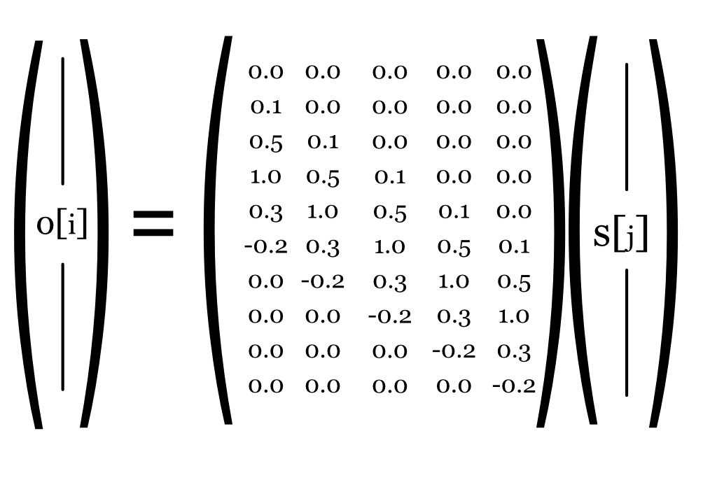 Here, the output at position \(n\) is a weighted sum of the input values, where the weights are determined by a “flipped and shifted” version of the PSF. This formula is the mathematical expression of the process shown in the LSI matrix tableau.