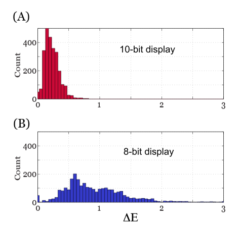 The distributions of CIELAB ΔE differences for the 10-bit and 8-bit displays are shown in the upper and lower histograms of Figure 6, respectively. For a 10-bit display, the signals within two digital steps are below ΔE=1. In this case, the visual discriminability is small enough to measure a psychophysical discrimination curve. If the display has only 8-bits of intensity resolution, the two digital steps frequently exceed ΔE=1. This explains why threshold measurements are impractical on 8-bit displays. For commercial purposes, however, one step is about ΔE=1, which explains why 8-bits renders a reasonable reproduction.