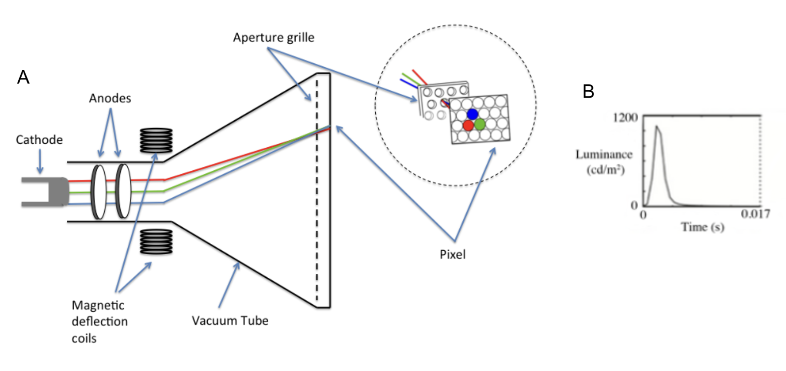 The temporal properties of the display are determined by the frequency with which each phosphor is stimulated by electrons and the rate at which the phosphorescence decays (see Figure 3B). The refresh rate is determined by how fast an electron beam can scan across the many rows of pixels in a display. The more rows there are, the more time it takes for the electron beam to return to the same phosphor dot. When the refresh rate is slow and the phosphor decay is fast, the display appears to flicker. Longer phosphor decay times reduce the visibility of flicker, but increase the visibility of motion blur (Farrell, 1986; Zhang et al, 2007).