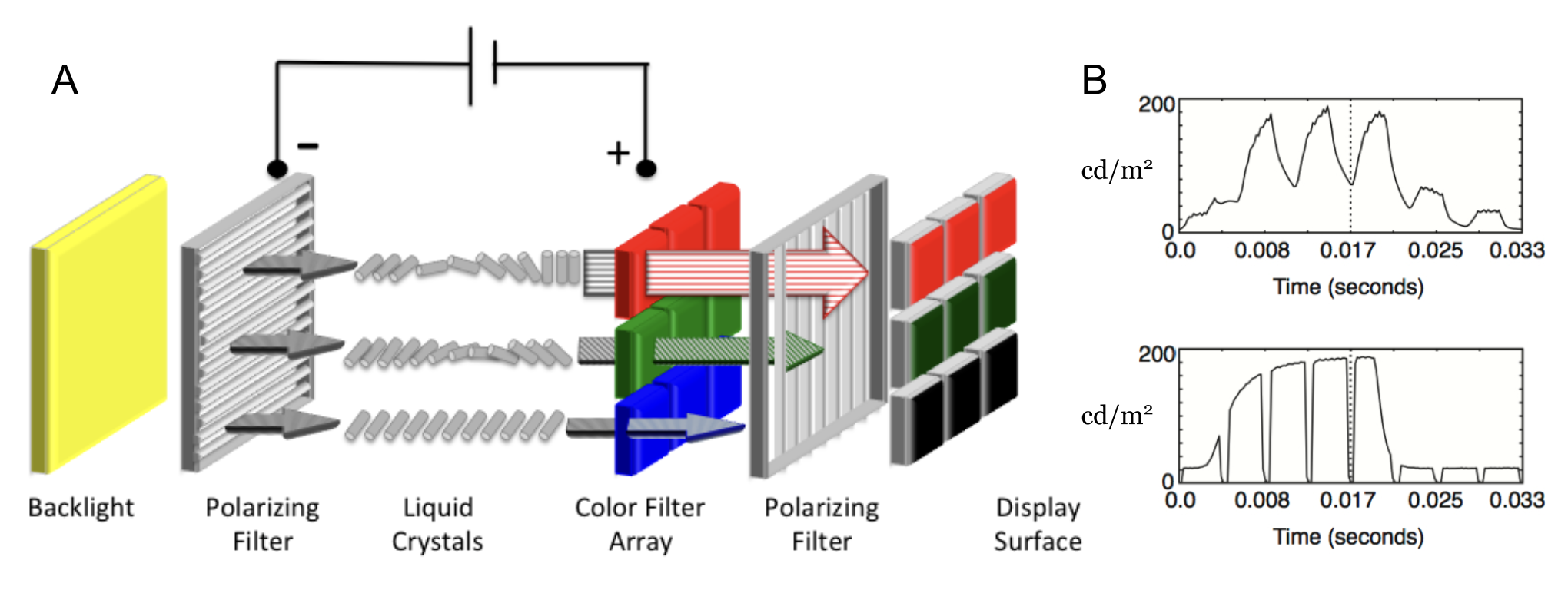 The spectral radiance of an LCD pixel is determined by the SPD of the backlight and the transmissivity of the optical elements (polarizers, LC, and color filters). The spatial properties of an LCD are determined by the dimensions of a panel of thin film transistors (TFT) that controls the voltage for each pixel component and the size and arrangement of each individual filter in the color filter array. The temporal properties of an LCD are determined by the modulation rate of the backlight and the temporal response of the liquid crystal (Yang and Wu 2006). LCDs use sample and hold circuitry that keep the liquid crystals in their “open” or “closed” state (see Figure 4B). This means that flicker is not visible, but a negative consequence of the slow dynamics is that LCDs can produce visible motion blur. Furthermore, liquid crystals respond faster to an increase in voltage (changing the alignment of the liquid crystals) than they do to a decrease in voltage (returning towards its natural state). Consequently, a change from white to black is faster than a change from black to white. Some LCD manufacturers have introduced circuitry to “overdrive” and “undershoot” the voltage delivered to each pixel. This additional circuitry reduces the visible motion blur, but it makes it impossible to separately control the spatial and temporal properties of the display. The slow and asymmetric changes in the state of liquid crystals also makes it difficult to have precise control in the timing of visual stimuli (Elze and Tanner, 2012).