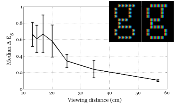 We used the spatial-spectral radiance data to calculate the Spatial CIELAB (SCIELAB) ΔE difference (Zhang and Wandell, 1997) between each letter simulated on the two displays and viewed from different distances. Figure 7 plots the median SCIELAB ΔE value as a function of viewing distance. The analysis predicts no visible differences between pairs of letters rendered on the two displays at any of the viewing distances. And indeed, we did not find significant differences between subject’s judgments about the quality of letters rendered on the two different displays (Farrell et al, 2009).