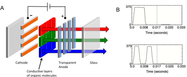 The temporal properties of an OLED display are determined by the rate at which the pixel intensities can be changed (update rate) and the rate at which the screen is refreshed (refresh rate). OLEDs can be turned on and off extremely rapidly (update rate). Hence, the refresh rate limits the motion velocities that can be represented (Watson et al, 1986). To reduce the visibility of flicker and motion blur, OLEDs can be refreshed at a rate that exceeds the update rate (see Figure 5B).