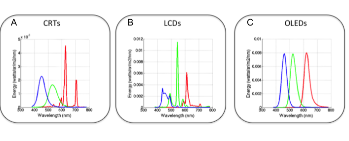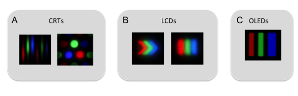 Given these benefits, and the fact that the cost of manufacturing OLED displays is decreasing, one might consider these displays to be ideal devices for vision research. There is, however, one potentially problematic aspect of OLED development for vision research. OLED display manufacturers are experimenting with different types of color pixel patterns and developing proprietary methods for rendering images on these new displays. Unless it is possible to turn off or at least control the proprietary display rendering, which may vary depending on the presented image, it may be difficult to know the spatial distribution of the spectral energy in displayed stimuli.