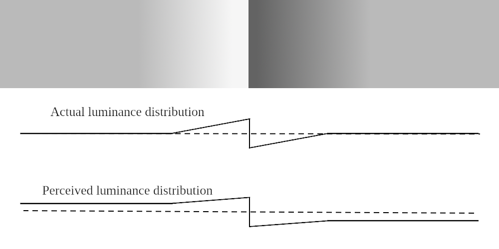A single local edge can change how you see a wide region. In the Craik–O’Brien–Cornsweet (Cornsweet) illusion the two large adjoining fields have exactly the same physical intensity, yet one looks lighter and the other darker. The only physical difference lies in a narrow luminance gradient (a “dipole”) straddling the shared boundary. Your visual system gives that gradient disproportionate weight and then “fills in” a brightness (or surface reflectance) level across the full interior of each region.