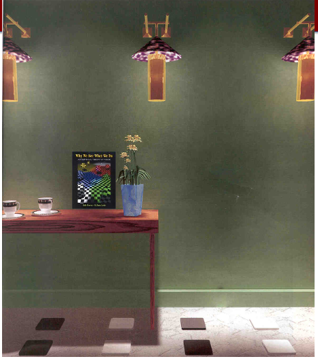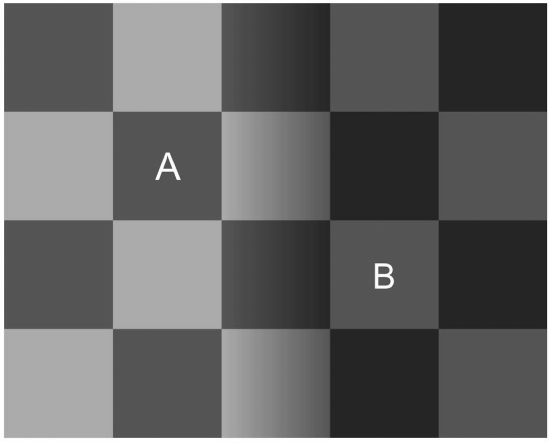 Lotto and Purves: A photorealistic version of the same principle. Two floor tiles (one apparently in bright light, one in shadow) have identical image intensities, yet you experience them as different materials (light vs. dark) because your visual system attributes the intensity difference to illumination, preserving a stable reflectance interpretation.