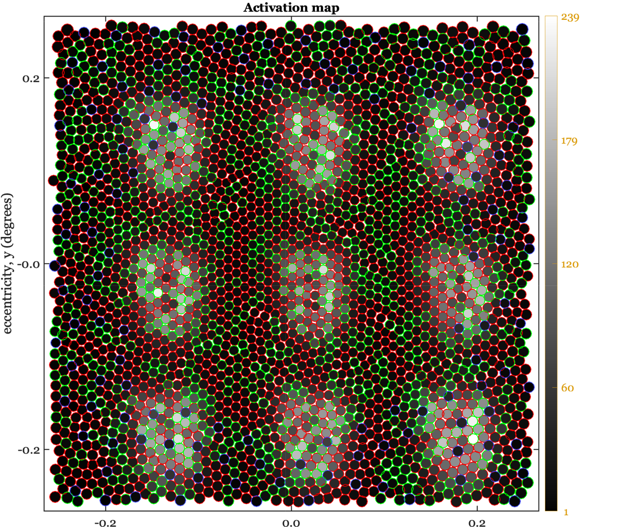 If we measure an input-referred spatial resolution, the eye’s sensitivity is considerably reduced with eccentricity. If we think purely in terms of the number of excited cones, the signal is much closer to constant from fovea to periphery. Perhaps this latter measure is the important one for how the nervous system is wired up. I can speculate a little, right? Though I sure would like a better story.