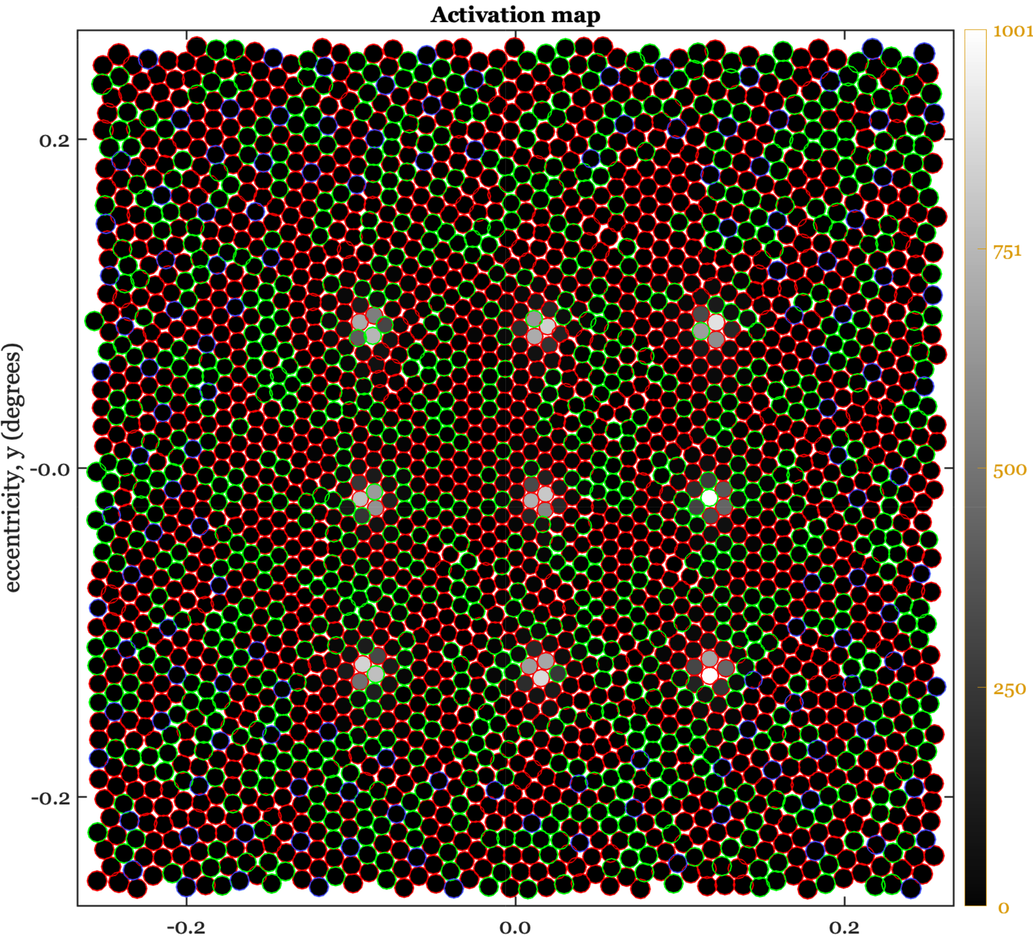 Modern measurements of the eye’s wavefront aberrations enable us to simulate the wavelength-dependent PSF at the cone mosaic effect. Recall that in the very center of the fovea, there are no S-cones. But there are some about 0.2 deg in the periphery. If you click on the images in Figure 22.12, you will see a simulation of the absorptions along with a label of the cone type by the color of the circle around each cone. For the 550 nm light in the left panel, the excitations are spread over only about 3 cones.