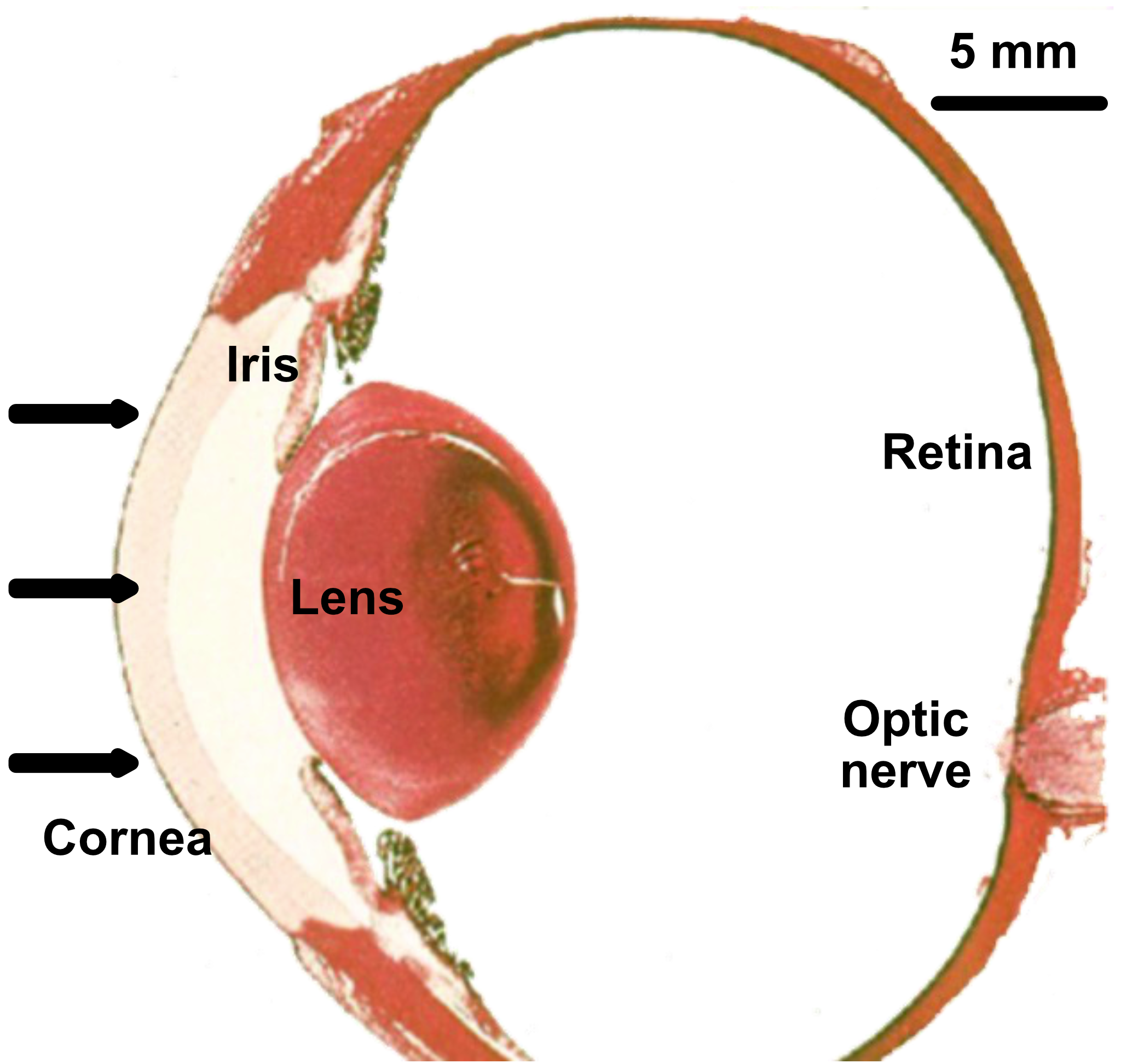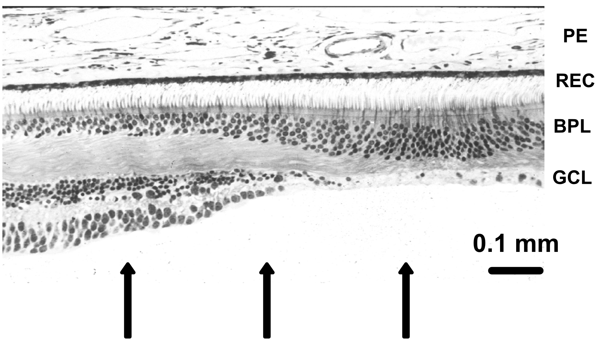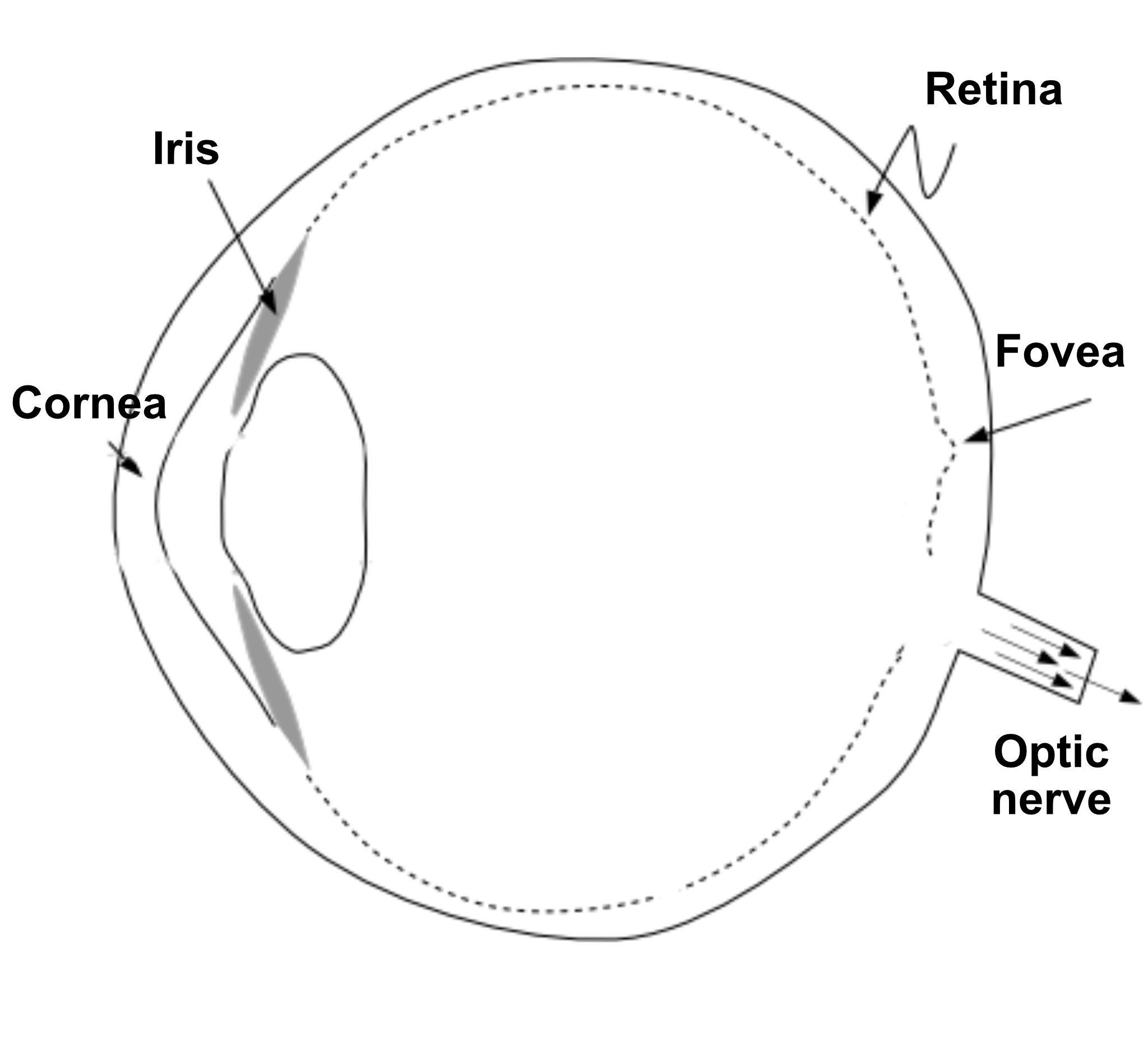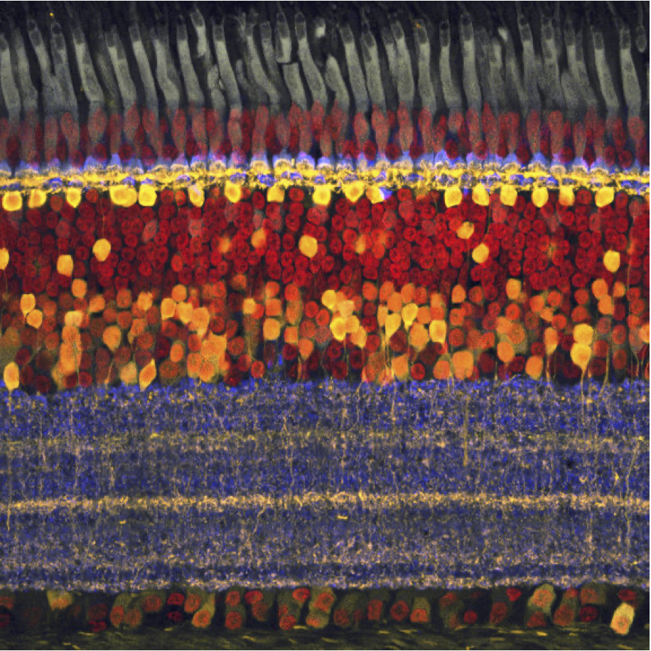 The retina is approximately \(200–300\) microns thick near the posterior pole, varying from about \(100\) to \(500\) microns across the retina. Its total area is on the order of \(10–12~cm^2\). It is a laminated neural tissue comprising three nuclear layers separated by two plexiform layers. There are on the order of 80 different cell types that can be identified through their genetic expression, responses to light, and anatomical form. The retinal cells form stereotyped connections, which we call retinal circuits. We believe that there are about 20 such circuits. The circuit outputs, carried on the retinal ganglion cell axons in the optic nerve, project to a variety of locations in the brain.