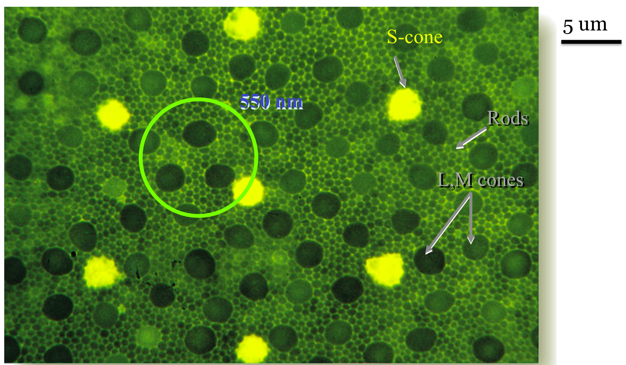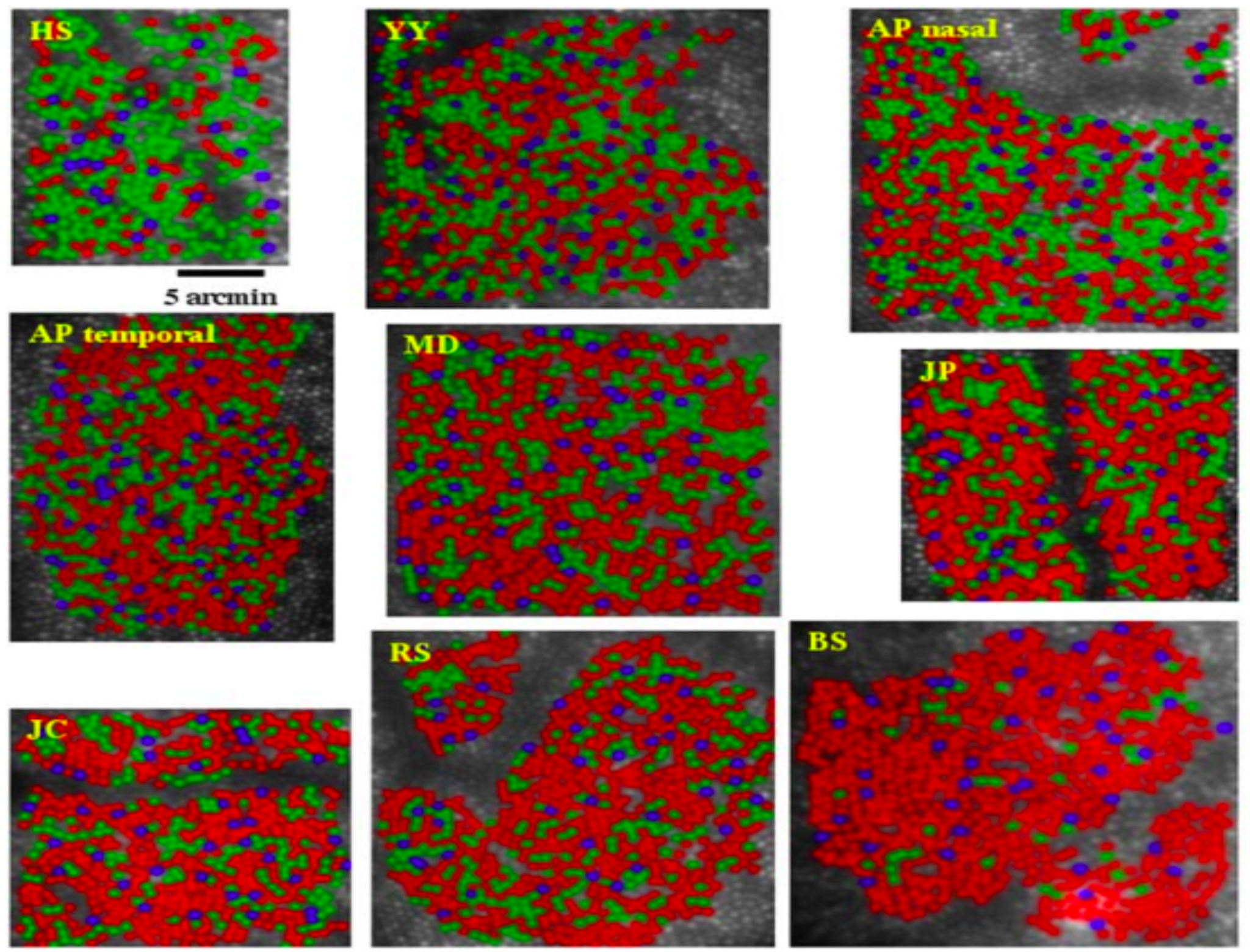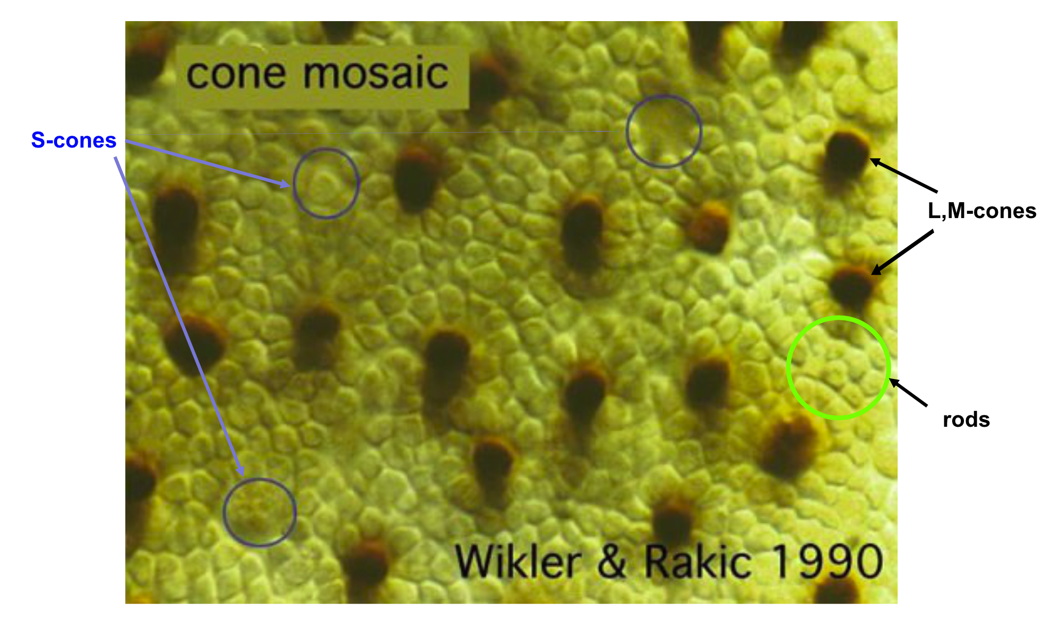 What is the arrangement of the different cone types in the human eye? Some data on this point emerged in the 1980s and 1990s when biologists discovered fluorescent markers that would attach to just one type of photoreceptor (DeMonasterio et al. (1981), Monasterio et al. (1985) Wikler and Rakic (1990)). These measurements could distinguish the L,M cones from the S-cones.