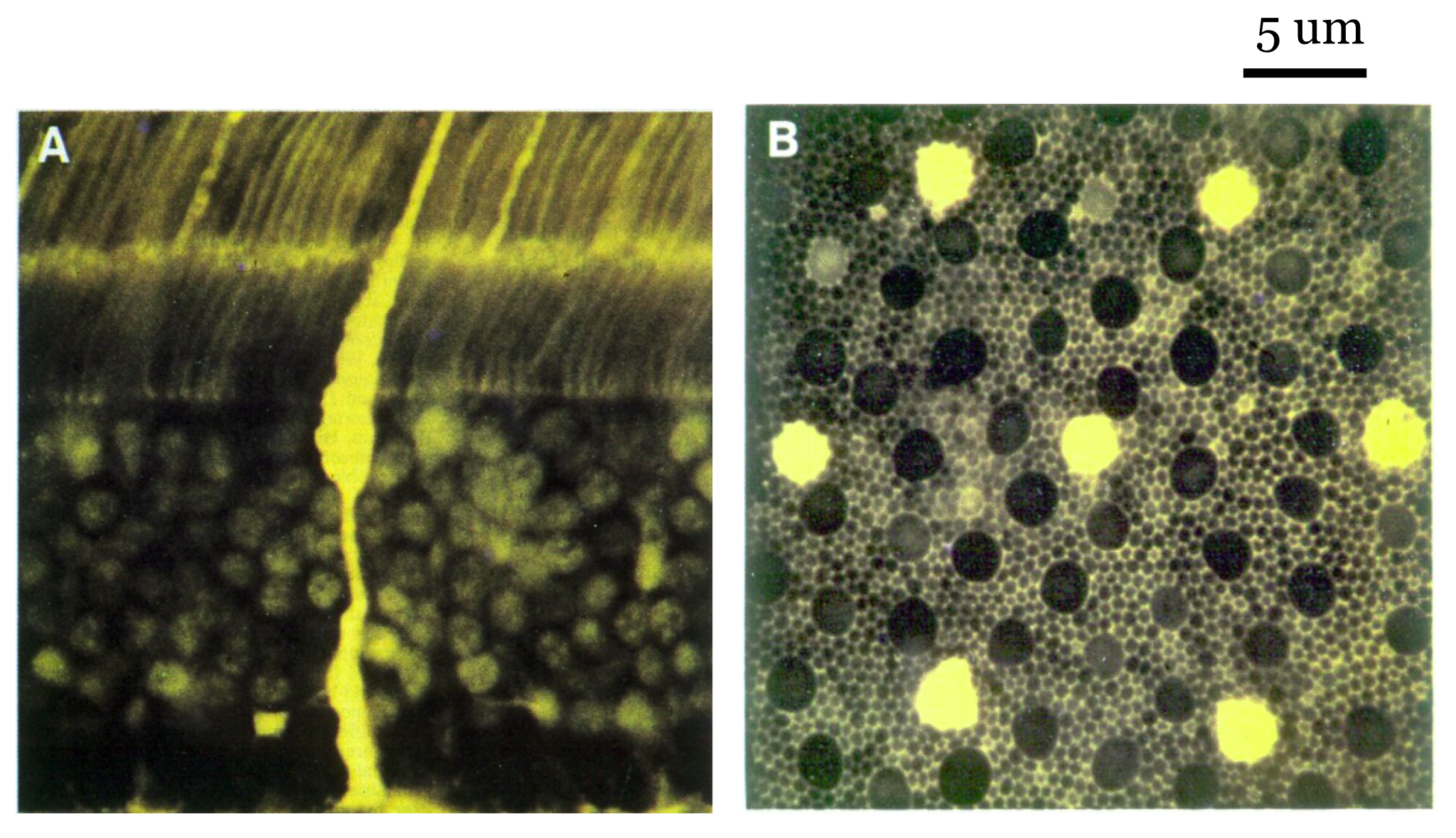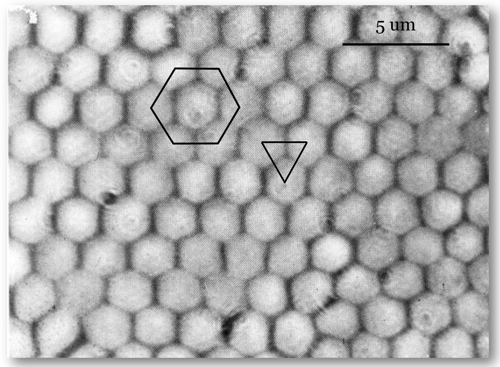 The spatial resolution of the human eye depends on the aperture size and spacing of the photoreceptor inner segments, particularly for the cones. A great deal was discovered about the sampling mosaic in the 1980s and 1990s Curcio et al. (1990). Prior to that time, the nature of the cone sampling mosaic and the importance of sampling were not widely appreciated. The importance of sampling was emphasized by Yellott and colleagues, who analyzed the spatial sampling. William Miller and Joy Hirsch, at Yale, were among the first to crisply show the dense packing (Hirsch and Miller (1987)). Over small patches of the primate retina the packing is quite dense (Figure 22.6), in a spatial arrangement called a triangular (hexagonal) packing.