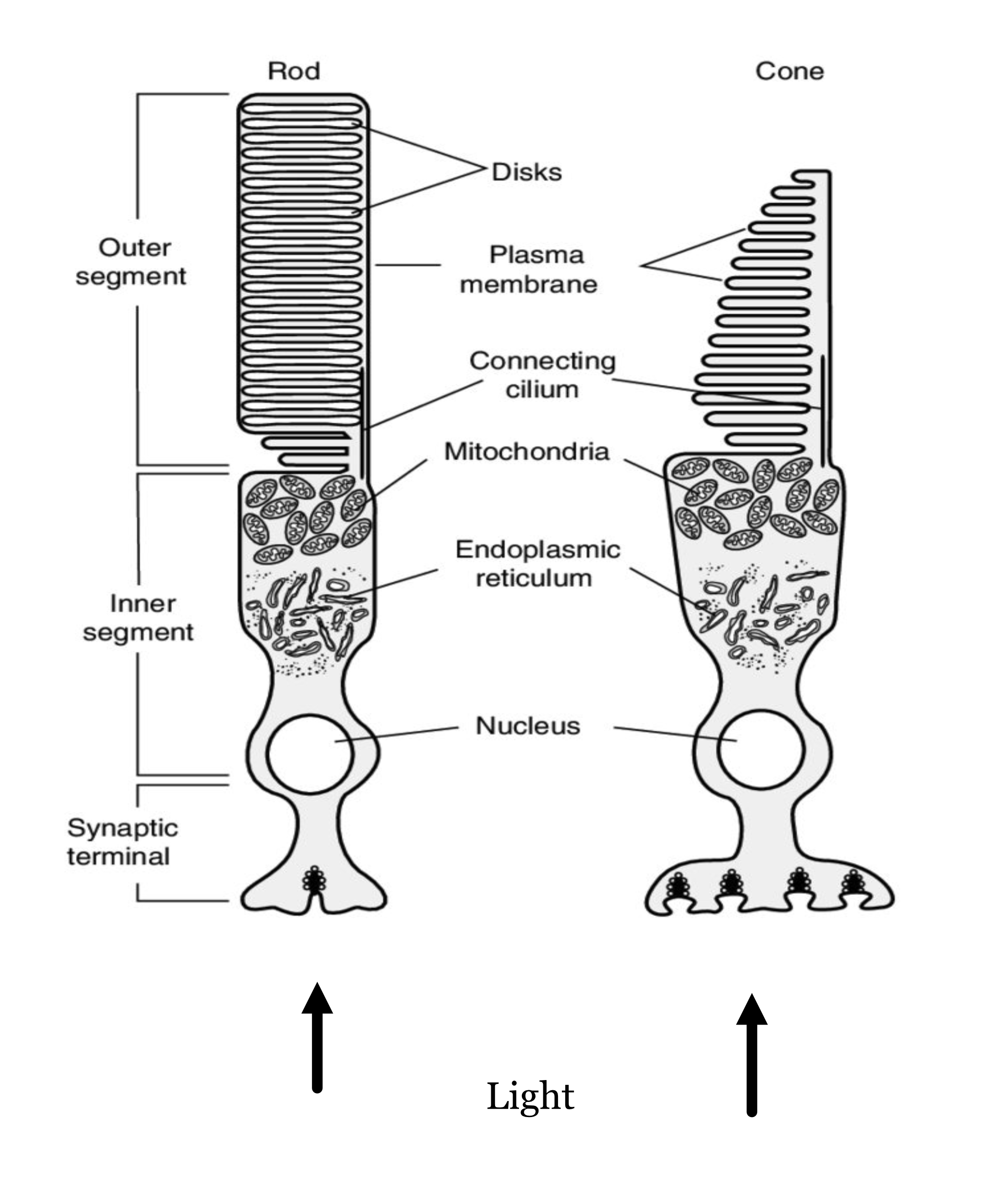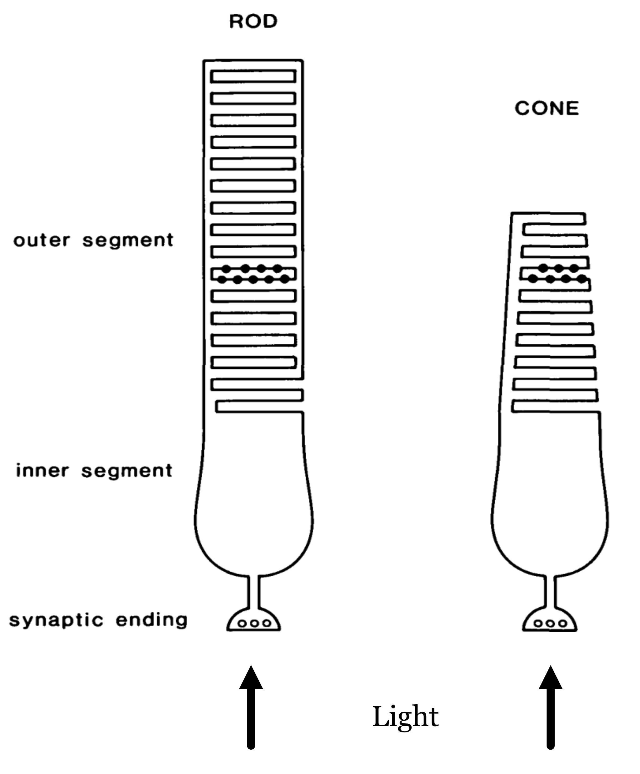 The rod and cone photoreceptors are specialized neurons whose principal function is to convert electromagnetic radiation into a neural signal. Both types of photoreceptors accomplish this using a light-sensitive pigment (photopigment). This pigment absorbs photons and, in so doing, initiates a chain reaction of events within the cell (Stryer (1986)). These events, the transduction cascade, result in a change in the synaptic signal from the photoreceptor. The spatio-temporal pattern of changes across the photoreceptor mosaic is the signal that the nervous system interprets and the basis of our sight.