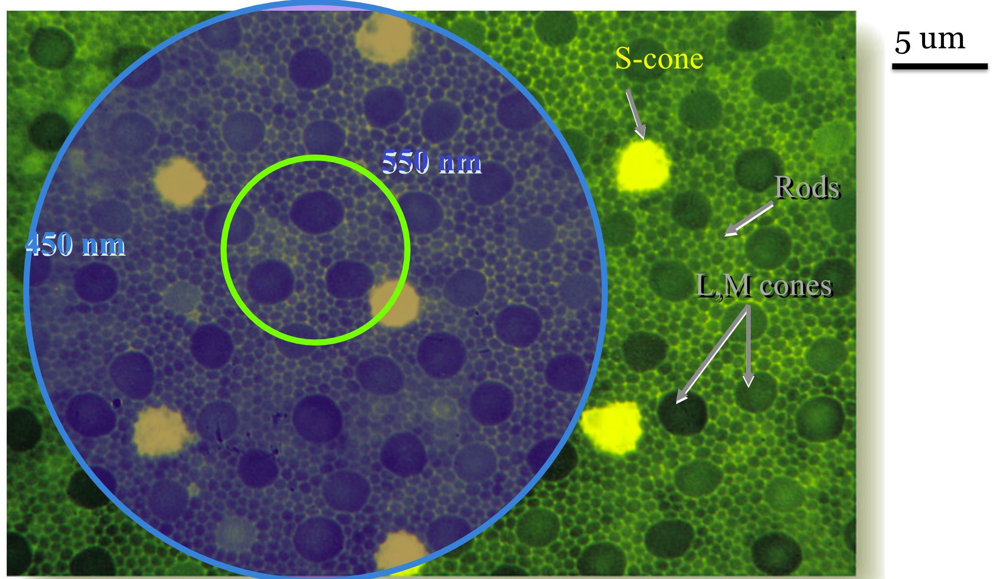 In normal viewing, the human eye’s optics brings the middle wavelengths are in good focus at the inner segment. Because of chromatic aberration, the short wavelength light is focused at the RGC layer, and measured at the inner segment layer the short wavelength light is considerably spread out (Figure 22.11). The defocus of the short wavelength light is wired into the design of the cone sampling density.