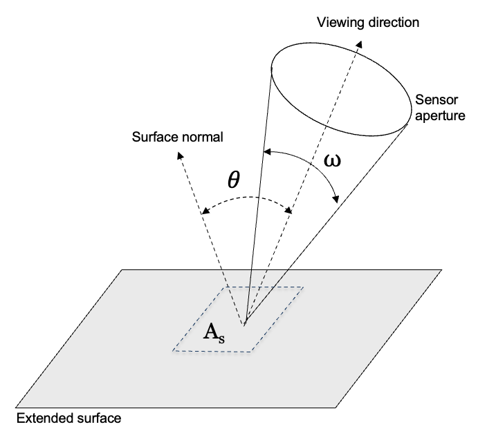 In many applications we measure radiance from a patch on an extended, flat surface - such as a large light fixture with a diffuser, a wall, or a large display screen. The geometry of such a measurement accounts for two main factors illustrated in Figure 3.3. First, we must account for the area of the surface patch, as seen from the detector. For example, if the measured surface patch is a square \(0.1\) meters on a side its area is \(A_s = (0.1~m)^2\). The area of this patch, as seen from the detector, is foreshortened. We calculate the foreshortened area using the angle between the viewing direction and the surface normal, \(\theta\), which becomes \(A_s \cos(\theta) ~ m^2\). Second, we account for the size of the bundle of rays captured by the detector. We measure this size by its three-dimensional angle, \(\omega ~ sr\), from a surface point that will be measured by the detector. The radiance combines the energy measured at the sensor (\(watts/nm\)) with these geometric factors. The standard symbol for spectral radiance is \(L(\lambda)\). It has units of watts per nanometer per unit foreshortened-area per steradian:
