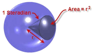 Often, we measure the light emitted by a point source in a particular direction, the radiant intensity. In that case we measure the energy within a cone of rays in a particular direction. The standard unit for angles in three-dimensions is the steradian, just as the radian is the standard unit for angles in two-dimensions. The radiant intensity has units of watts per steradian per nanometer (watts/sr/nm). Thus, if the measurement instrument measures energy over an angle of 0.5 steradians, we divide the measurement by 0.5. If the instrument sums over 10 nm bands, we divide the energy by 10. In this way, the radiant intensity normalizes the angle we measure to the unit steradian and per nanometer. The standard symbol for radiant intensity is \(I(\lambda)\).