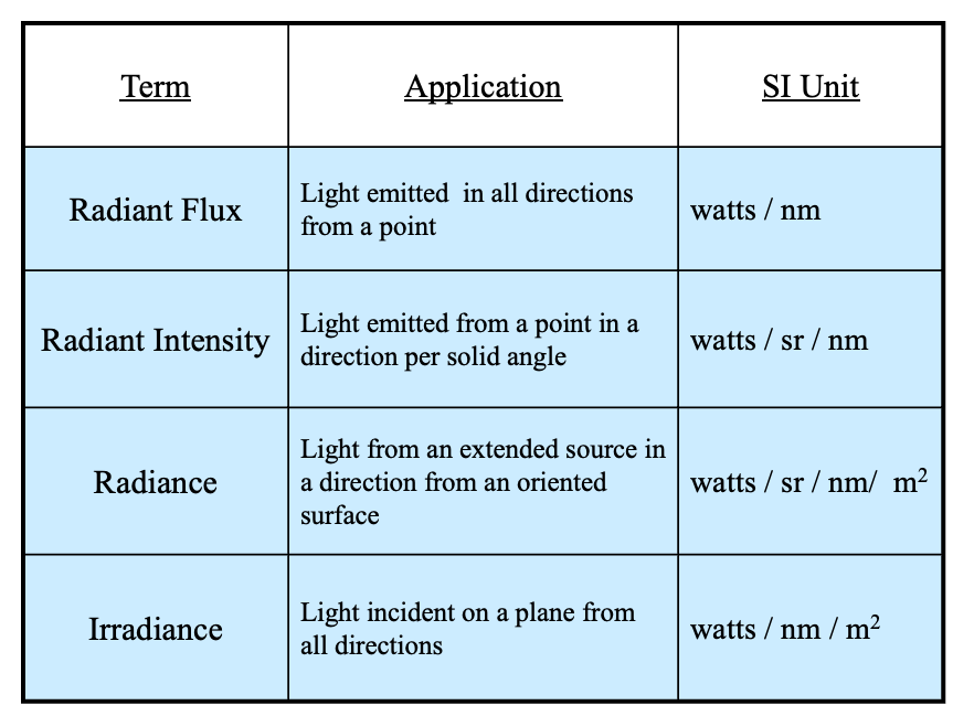Radiometry defines units that are helpful for different types of geometry. The radiometric measures can be divided with respect to those from a source (radiance) and those arriving at a surface (irradiance). These can be further divided with respect to measurements from a small (point) source, or from an extended surface.