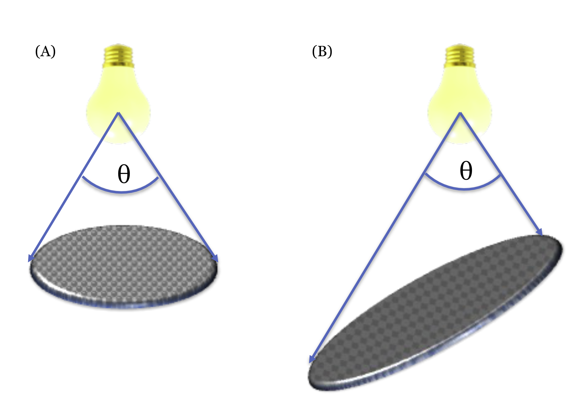 The amount of light from a small source, say a point source or a light bulb, that irradiates a surface depends on the geometry relating the light source and the surface. Figure 3.6 illustrates two cases: the same angular rays emerging from both light bulbs. On the left the surface is perpendicular to the direction of the central ray. On the right, the surface is slanted and not perpendiulcar; th same bundle of rays is spread across a larger surface area. Thus, there will be less light per unit area when the surface is not perpendicular to the main ray. In the most extreme case, when the surface is parallel to the central ray, no light will fall on the surface at all.