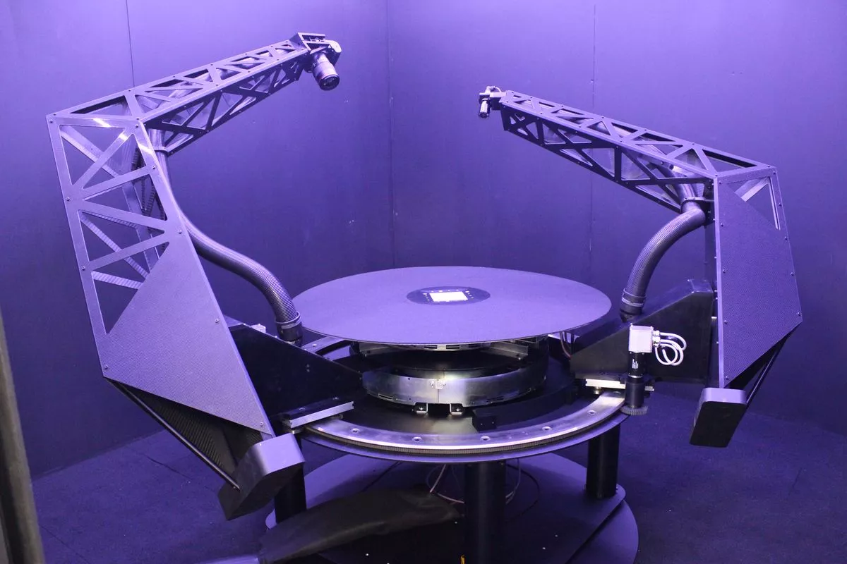 The instrument used to measure the BRDF is called a gonioreflectometer. The instrument has a light source that can be positioned to illuminate the surface at many different angles (typically on a sphere), and a detector that can be positioned at many locations on the sphere. There are many different designs for gonioreflectometers. The one in Figure 5.13 shows a surface is placed on a stage that can be rotated. The light and camera are on two arms whose positions can be controlled, sweeping out the possible angles for the incident and reflected light. To measure the reflectance of a surface requires calibrating the amount of incident light, say by making a measurement with a perfect, white diffusing surface, and then making a second measurement with the material of interest. The ratio of the responses is the reflectance. The same calibration measurement can be re-used for multiple materials of interest.