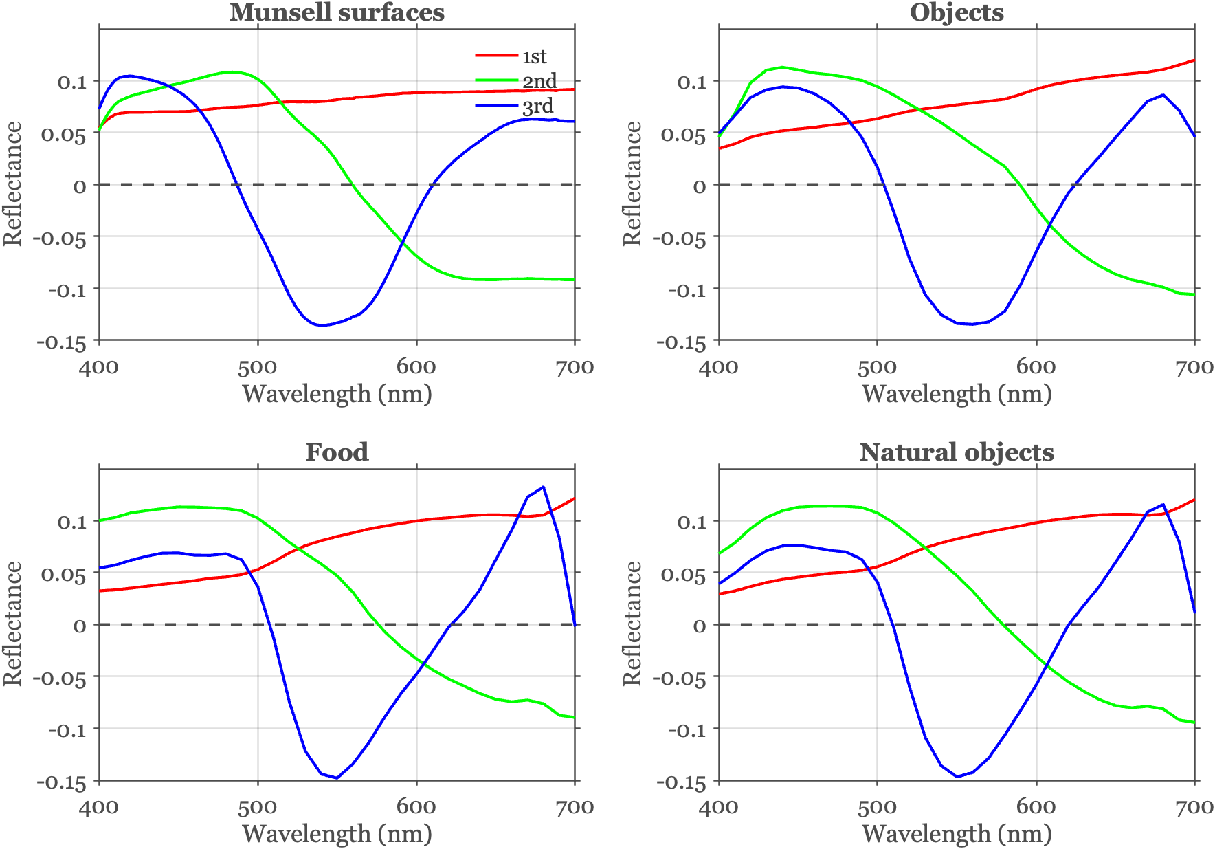 The linear models for diffuse surface reflectance of several types of common materials are similar (Figure 5.9). The data from Vrhel and colleagues Vrhel et al. (1994), included in ISETCam, measures a few dozen surfaces from several different groups (paint, natural objects, man-made objects, food). It is likely the authors chose the samples to have similar means and a broad representation of color appearances. For this sampling strategy, the first component will necessarily be similar. But the 2nd and 3rd basis functions are also similar, and this is less likely to be a selection artifact. Rather, the similarity arises because the diffuse spectral reflectance functions are very smooth functions wavelength Maloney (1986).