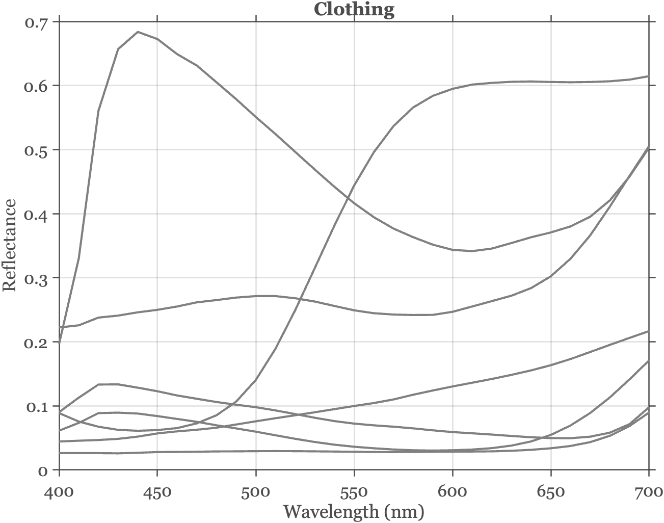 We can summarize the spectral reflectance of a diffuse material relatively simply because we do not need to specify the input and output angles. We only need to measure the fraction of incident light, for each wavelength, is reflected. This is called the spectral reflectance function. In the visible band these functions are often smooth, and it is possible to summarize them using only a few parameters. It is not realistic to sample all possible surfaces, but we can consider surfaces in a particular context (e.g, walking in a forest, clothing, the interior of a commercial office building, driving on a highway, or medical images of the body). The likely surfaces in any particular context can be usefully summarized with a linear model Hardeberg (2002). The number of basis functions needed will depend on the task requirements (e.g., 5% or 1% accuracy). But the general usefulness of a linear model approximation as a computational tool is not in doubt.