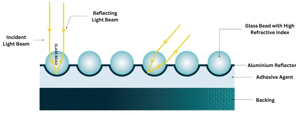 The figure includes a fourth interesting case: retroreflective materials. For these materials the reflected ray is sent back in the same direction as the incident ray. These materials can be created by embedding small, spherical, glass beads with a metallic back surface into the material Figure 5.12. The glass beads refract the incident ray, the metallic surface returns the ray, which is again refracted, so that the net effect is the reflected ray is returned in the direction of the incident ray. Glass beads with a metallic backing are often built into road markings and road signs. Light from a car’s headlight is scattered back towards the driver, increasing the visibility of the road marking or sign during nighttime driving.