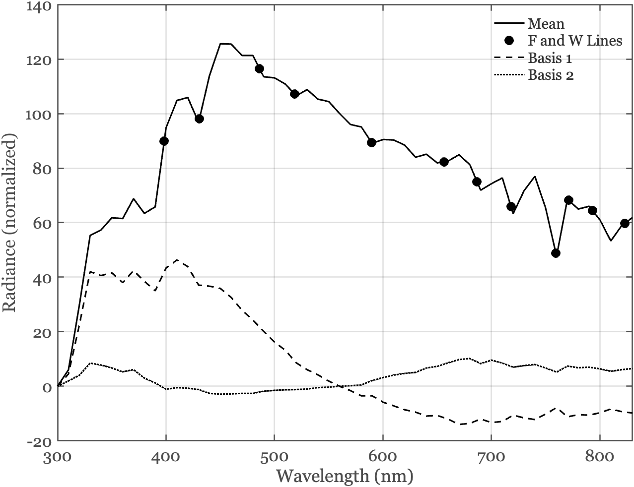 These combined factors—atmospheric composition and path length variations—create a complex, but restricted, distribution of sky radiances at the Earth’s surface. To summarize the regularities, scientists and engineers have created linear models that can represent the natural variations. The original model was introduced by Judd, Macadam and Wyszecki (Judd et al. 1964). They analyzed skylight at the Earth’s surface using about 650 different measurements. They found that the spectral power distributions, normalized to remove absolute radiance level, could be modeled as the weighted sum of three terms: a mean and two basis functions (Figure 5.3). Such a model is useful because it enables us to represent any particular sample using just three numbers, the two weights and an overall scalar to match the level. The model is also useful for applications in which a scene is acquired under full sky illumination, and we would like to estimate the spectral power distribution of the skylight. We only need to estimate the weights, and from those we can make a good estimate of the full spectrum.