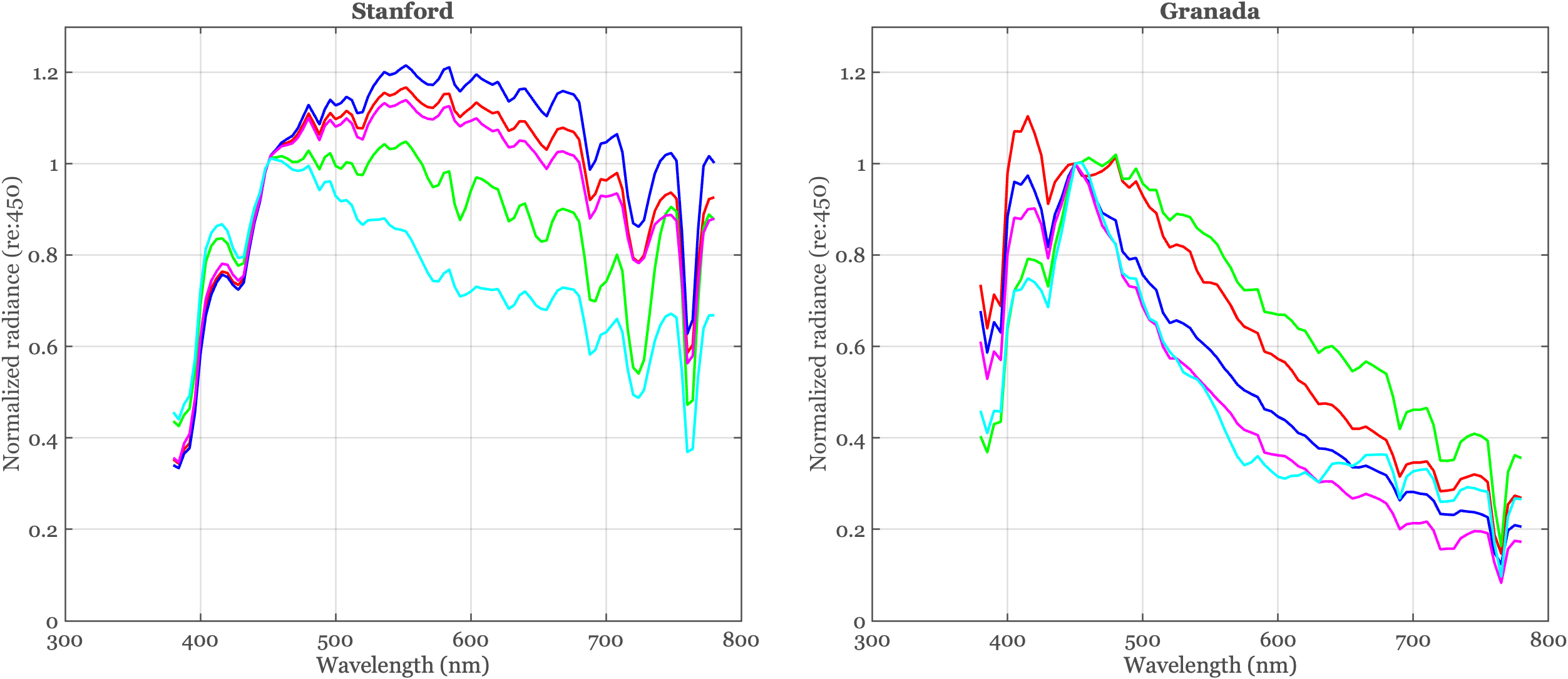 A number of different groups have reported measurements of solar radiation at the Earth’s surface at varying times of day and weather conditions (Judd et al. 1964). Figure Figure 5.2 shows examples of typical variation in the shape of the spectral power distribution in Granada, Spain (Hernández-Andrés et al. 2001) and Stanford, California (DiCarlo and Wandell 2000).