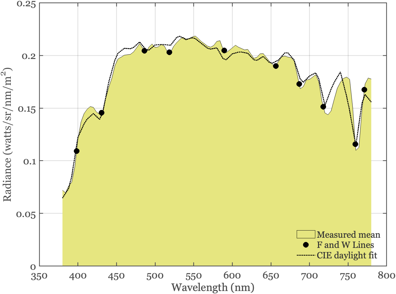 Figure 5.4 shows the mean spectral power distribution of these measurements. You can see that the instrument recorded several ‘notches’ in the spectrum at wavelengths corresponding to the Fraunhofer and water vapor lines. We also asked whether these data could be fit by the CIE linear model - and the least-squares fit is shown by the dotted line. I suspect there is an instrument calibration error of a few nanometers at wavelengths above 700nm, and were I to write a research paper based on these data, I would probably introduce the correction because I believe the physics on the locations of these wavelengths is secure. This analysis might provide you with a sense of the relative accuracy of measuring and approximating spectra with conventional lab equipment.