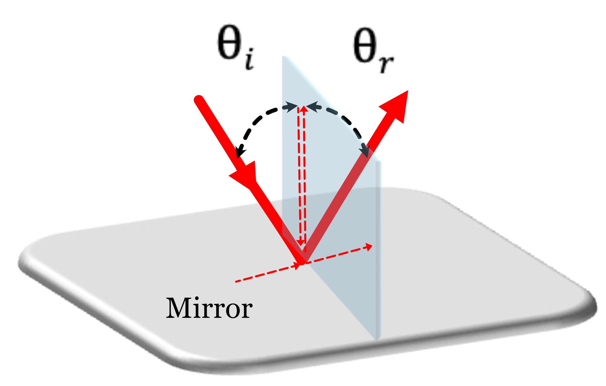 The conceptual opposite of diffuse reflection is mirror reflection. In this case, an incident light ray from one direction reflects from the surface in just one direction. The geometry of mirror reflection is shown in Figure 5.10. The incident ray, reflected ray, and surface normal all lie in the same plane (the plane of incidence). The angle of incidence is equal to the angle of reflection, and the surface normal acts as a line of symmetry in the plane of incidence.