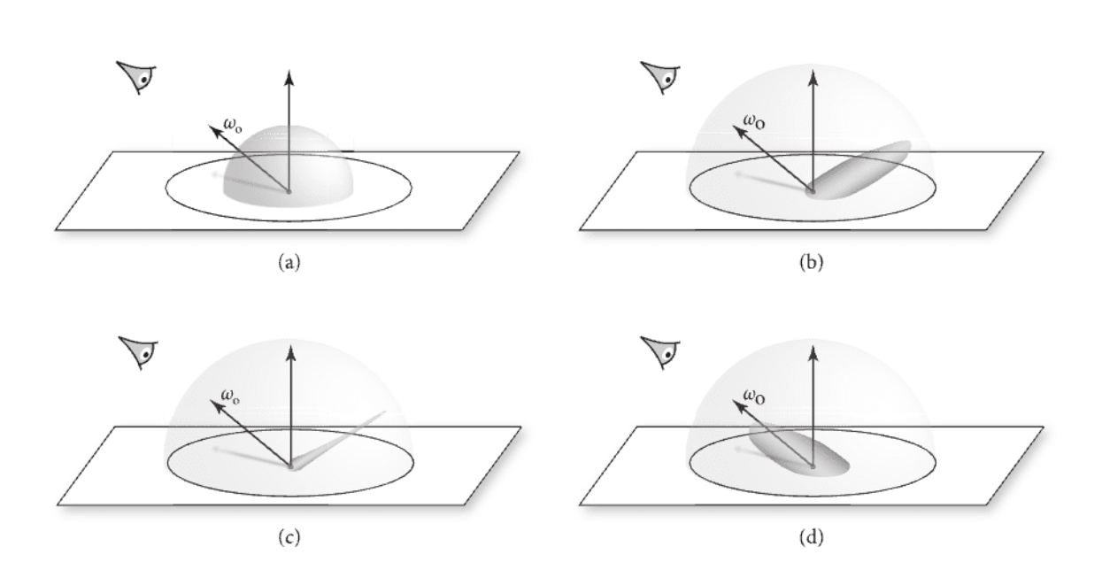 The bidirectional reflectance distribution function (BRDF) characterizes how light rays of wavelength \(\lambda\), incident at the surface at an angle \(\omega_i\), are reflected. The reflected, outgoing light is specified at all angles \(\omega_o\). Both \(\omega_i\) and \(\omega_o\) are measured with respect to the surface normal. We can write the intensity as a function of input and output angles as the function \(B(\omega_i,\omega_o,\lambda)\). The reciprocity of principle of light1 implies that the BRDFs, with only a few exceptions, obey this symmetry relationship.