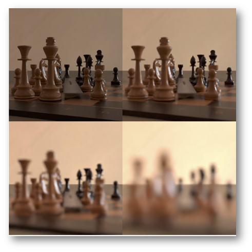 It is also possible to use pinhole computations to illustrate the limitations of this model in real image systems. In Figure 7.4 I rendered a chess set scene with the pieces, each a few cm tall, positioned about 0.5 meters from the pinhole camera. The four pictures were rendered using different pinhole diameters. The upper left allows only one ray through from each location in the scene. The aperture diameters for the next three pictures are for three different pinhole sizes. The images are brighter as the pinhole size increases. For this example, the image at the two smaller pinhole sizes are tolerable. Depending on your viewing distance from the screen or page, the third pinhole image might be usable. But the largest pinhole, which lets in the most light, loses so much spatial information that the individual pieces blur together in the image (Section 7.7).