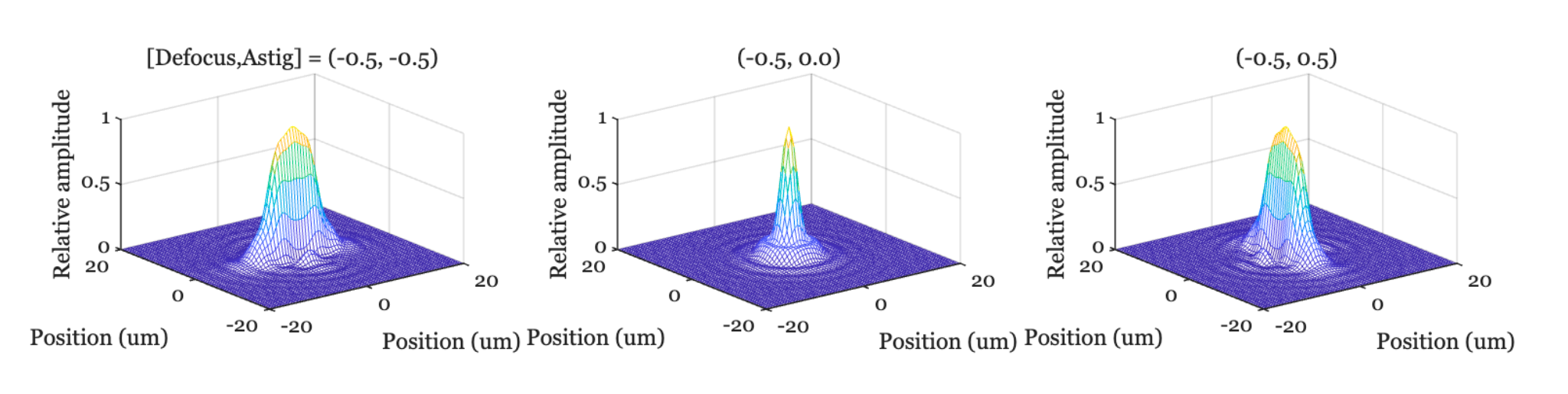 Even though the PSF is quite irregular, we often approximate its shape. One approximation summarizes whether or not the PSF is very different in two directions. If it is very different in two perpendicular directions, we say the person is astigmatic. Figure 7.17 shows PSFs with some defocus and astigmatism. These were simulated using the same wavefront methods I described above and that will be covered in Chapter 13.