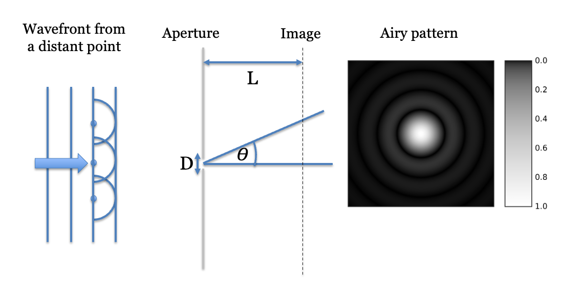 Second, consider the light pattern we expect for a plane wave passing through a pinhole aperture. This pattern can be calculated using a formula derived by the astronomer, George B. Airy (Airy 1835) and is shown in Figure 7.12. The Airy pattern has a central bright spot (the Airy disk), which is surrounded by a series of concentric rings. The size of the pattern depends on the wavelength of the light \(\lambda\), the diameter of the pinhole \(D\). Unlike the ray model, for the diffraction case the rays are expanding so that the distance \(L\) from the pinhole to the image plane matters. The image is radially symmetric with a bright spot in the center, surrounded by a set of concentric rings of decreasing intensity. The Airy disk contains about 85% of the total energy. The mathematical notation for the Airy pattern is a bit complex, but the diameter of the Airy disk, \(d\), has a simple formula