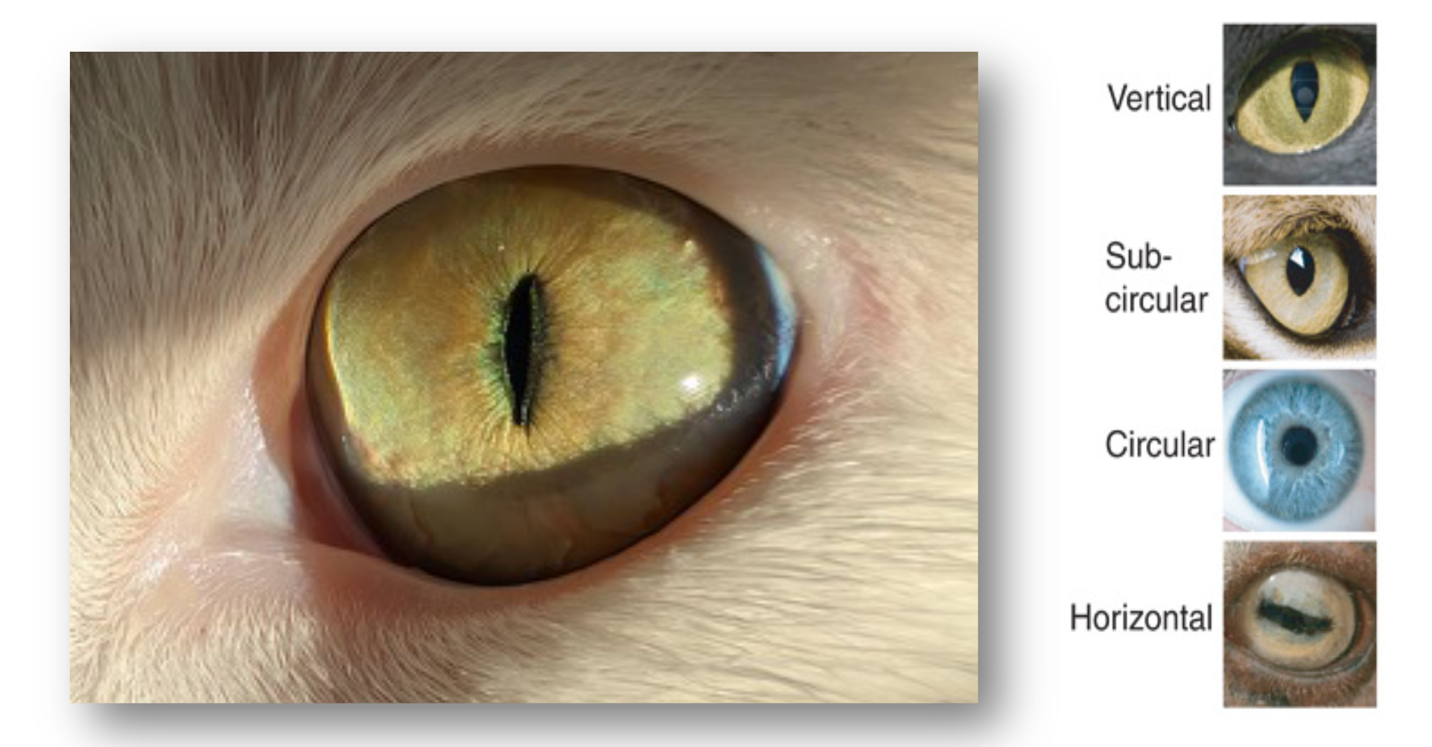Approximately rectangular pupils are fairly common in biology, as well, and the pupil shape is associated with how they live their lives (Banks et al. (2015)). Vertically elongated pupils are associated with ambush predators that are active both day and night. So beware! Horizontally elongated pupils are more likely to be found in prey, who also have laterally placed eyes that helps them look all around.
