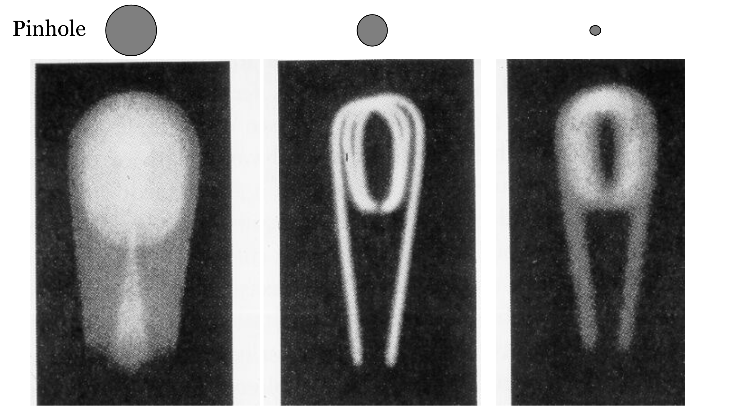 The trade-off between pinhole size and image sharpness provides a second, compelling example of diffraction. In their classic textbook, Jenkins and White showed a series of images of a light bulb filament through pinholes of decreasing size (Jenkins and White (1976)). As predicted by the ray model, reducing the pinhole size initially sharpens the image. But beyond a certain point, further reducing the pinhole size makes the image blurrier, directly contradicting the ray model. These observations demand an explanation that goes beyond geometric optics.