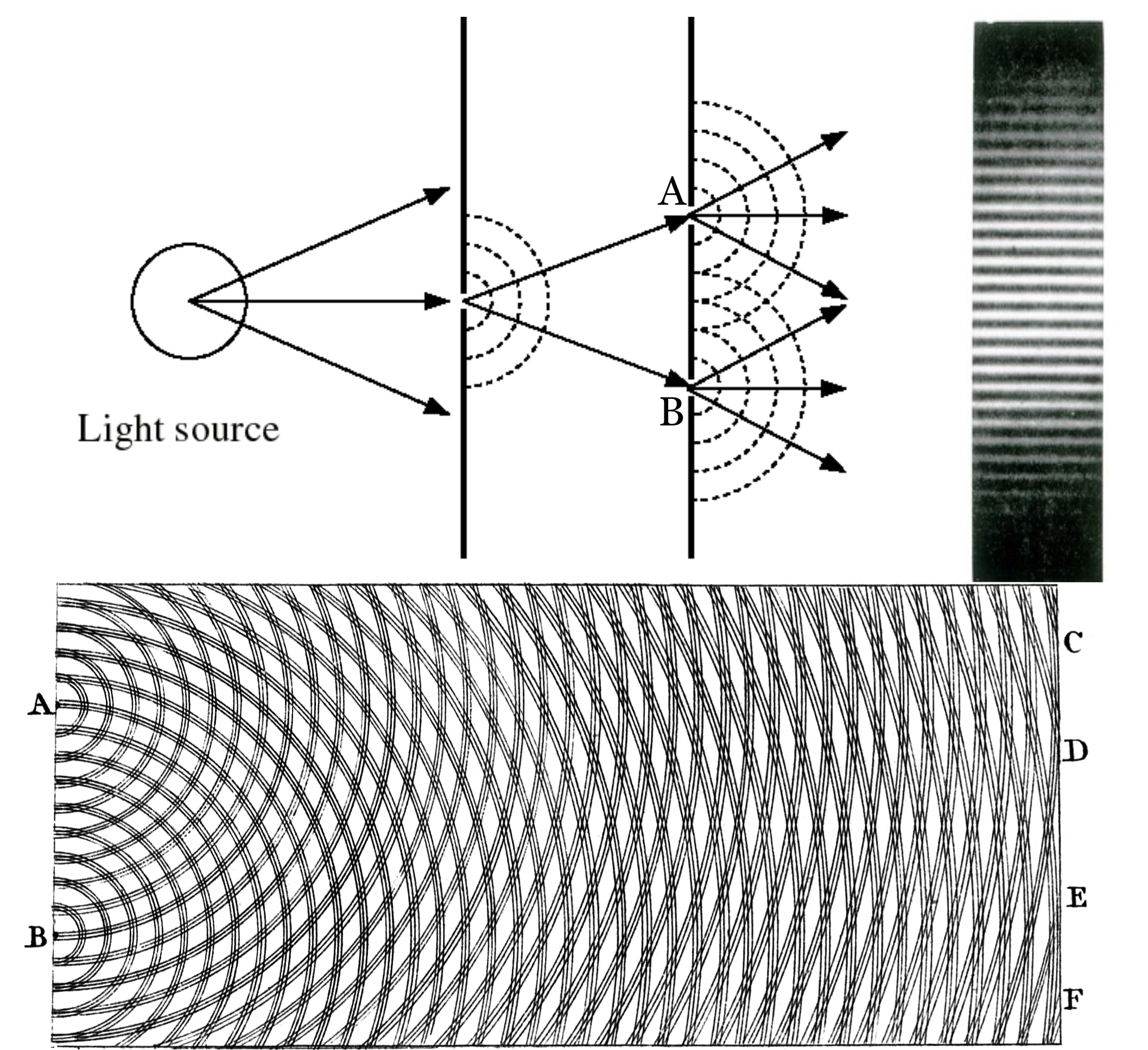 Even though Huygens theory did account for many important phenomena; to me the simple observation in Figure 7.7 decisively demonstrates the necessity of a theory that allows for waves. Nonetheless, it wasn’t until Thomas Young presented his famous double-slit experiments to the Royal Society in 1801–1803 that Newton’s hold on the field began to loosen (Young (1804b)). This paper was a crucial step in the shift of the scientific consensus towards the wave theory of light. The ability to see the interference fringes provided quantitative, unmistakable proof of the value of the wave theory. Only waves, not particles, could add and cancel in this way and made the phenomenon hard to ignore. Young -and many others- considered- the demonstration of interference to be decisive1.