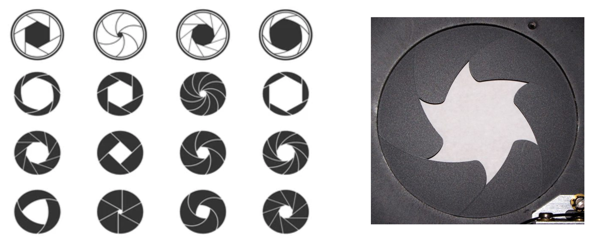 Classic cameras with mechanical shutters often had regular polygon shapes (left) or the interesting ‘leaf’ pattern at the right. These apertures introduce structure into the PSF that differs from a circularly symmetric aperture.