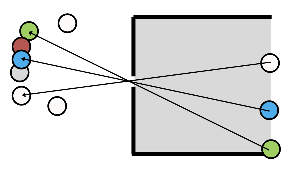 If we model light as a collection of rays, it is easy to understand why imaging through a pinhole produces an image (Figure 7.1). The figure shows a set of objects on the left. The camera is a dark chamber with only a pinhole opening. The image is formed on the planar surface, at the right. The light rays travel in a straight line, so only a small subset of the rays from each object passing through the pinhole. We can trace the light path by starting at a point on the image and drawing a straight line into the object space. The geometry illustrates how the rays from adjacent objects arrive at adjacent positions in the image plane, forming a reversed and inverted image.