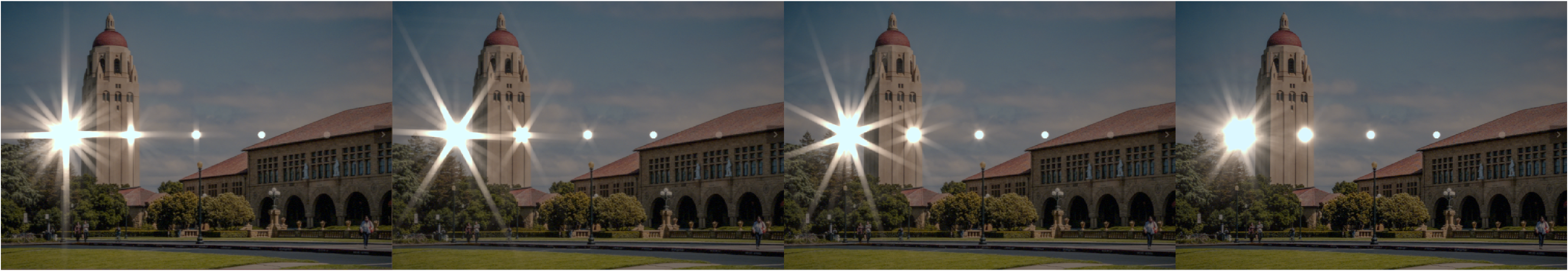 For the simulation in Figure 7.16, I also added some scratches and dust on to the lens for realism. The brightest light in each scene (left) is five orders of magnitude (\(10^5\)) more intense than the dimmest light (right), which is barely visible. The lights are all the same size, but the bright ones appear larger because of the blurring by the PSF.