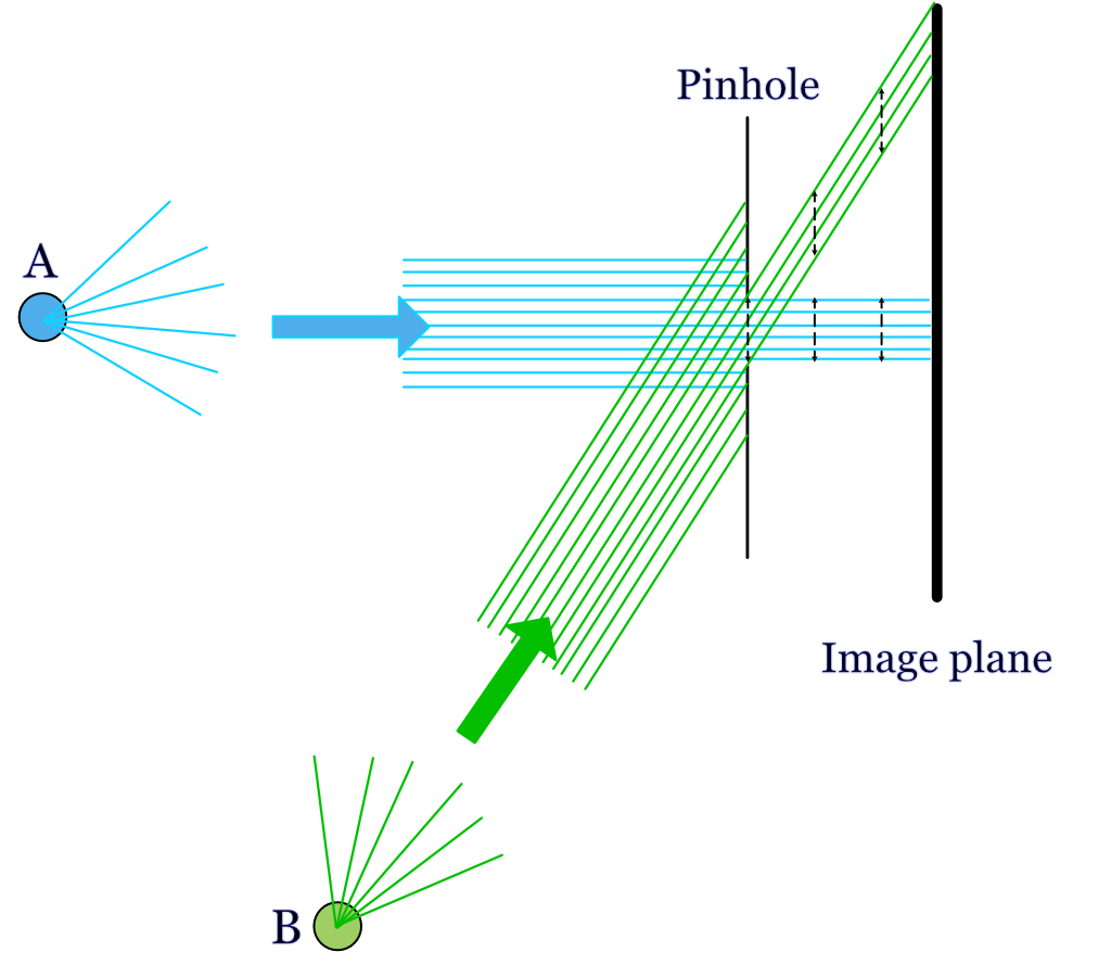 For an object point, A that is aligned with the pinhole (on-axis), the ray model of light predicts that the rays will continue straight through the pinhole aperture and form an image that is very close to the same size as the pinhole itself. Consider a distant off-axis point, B. Its rays, too, will start in many directions and only a narrow, collimated subset of rays will arrive at the pinhole aperture. Because of the angle between the collimated rays and the pinhole, a smaller fraction of the rays will pass through the pinhole aperture. There will be less light from B than from A. The relative amount of light that makes it through the pinhole depends on the cosine of the angle between the pinhole and the rays. But the shape of the image from the two points does not differ. If the pinhole is circular, on- and off-axis points will produce a circular image with the same diameter as the pinhole.