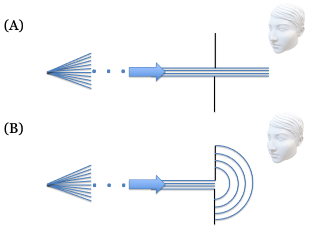 When a plane wave travels through open space, the constructive interference of all the secondary wavelets results in a new plane wave that propagates straight ahead, much like an ocean wave. However, when this wavefront passes through a small aperture or near an edge, the aperture blocks most of the secondary sources. The few wavelets that do pass through are revealed, causing the light to spread out spherically.