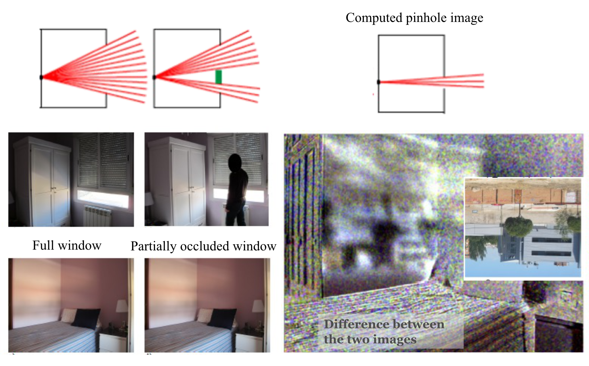 Torralba and Freeman (2012) described examples of naturally occurring pinhole cameras, and how to create a pinhole image computationally even when a window is too big to produce a useful image. They say you can take record the very blurry image from a large window opening, and then you can put a small occluder into the window (maybe stand sidewise in the middle of the window) and take a second image. Then, subtract the two images. By the Principle of Superposition, the difference image corresponds to the image when the aperture was the same size as the occluder. This method is more complex to implement because it involves acquiring two (linear) images and then subtracting them. And the world might have changed between the time you took the two image. But it’s a good trick for spies who are desperate to learn where they are being held hostage.