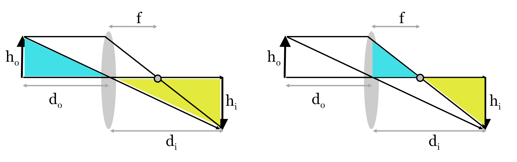The rays in Figure 9.7 identify two pairs of similar triangles (cyan and yellow). On the left, we can see that the triangles imply \(h_i/h_o = d_i/d_o\). On the right, we can see that the triangle similarity implies \(h_i/h_o = \frac{d_i - f}{f}\). Combining the two equalities, we have