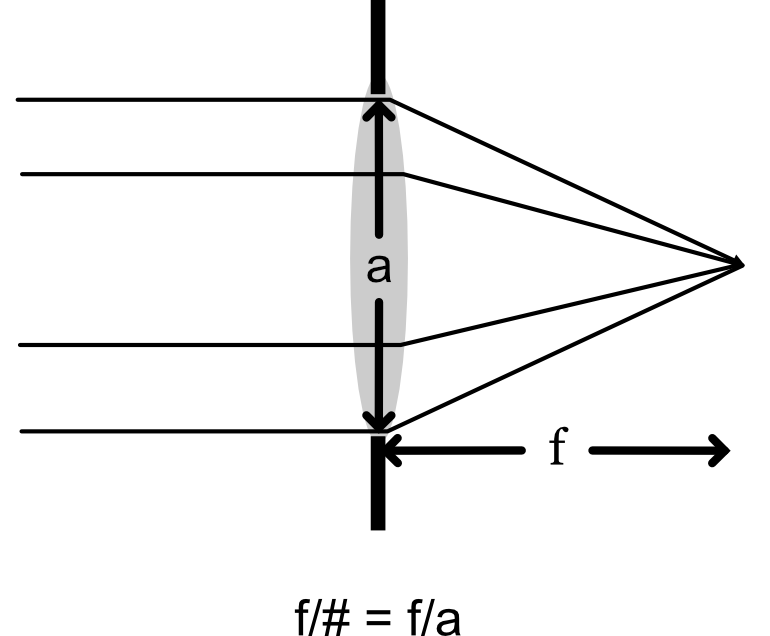The \(~\mathrm{f}/\#\) of a thin lens is the ratio of its focal length and entrance aperture diameter (Figure 9.9). For example, when we write f/4, it means that the focal length is 4x the aperture diameter.