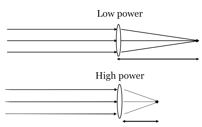 The power of a lens is the inverse of the focal length, in meters. The unit for lens power, \(1/m\) is the diopter. A short focal length implies large power, either due to the curvature of the lens surface or the refractive index of the lens material.