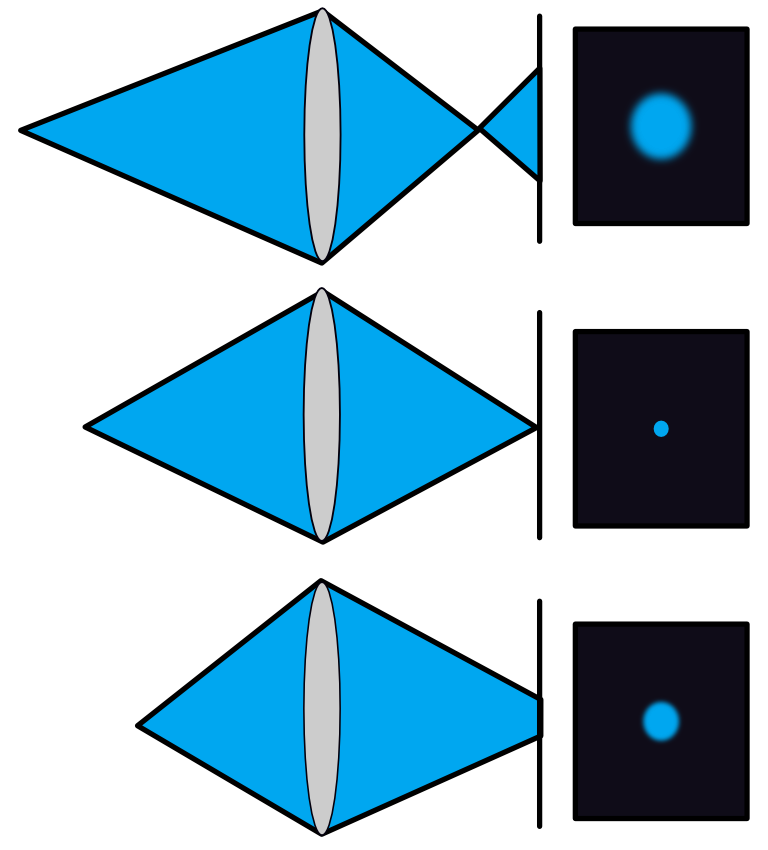 Consider an image formed with a thin lens that is kept at a fixed distance from the image plane (Figure 9.13). The middle image panel shows an object in excellent focus, and the other two panels show points that are too near or too far. As the point moves away from the in-focus object distance, in either direction, the image will be a roughly circular region increases in diameter. This is the circle of confusion. It is a useful concept that is specifically helpful for understanding and quantifying the depth of field.