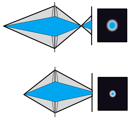 To measure the focal length of a lens we use a light source that produces parallel rays at the entrance aperture of the lens. We then slide the image plane back and forth, searching for the distance where the spot is smallest. We can create parallel rays using many methods. Perhaps the simplest is to use a small point source (e.g., an LED) at a distance from the lens. The rays arriving at the lens will be a small angular sliver of the emitted rays, and if the source is far from the lens the rays will be very close to parallel (e.g., Figure 7.3). An alternative, is to go outside on a sunny day and use the sun as a source. The sun isn’t small, but it is really far away. By the time the rays from the disk of the sun arrive at your lens, the rays will be parallel.