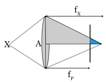 The diameter of the circle confusion can be calculated using this geometry. Suppose the image plane is placed so that a point \(P\) is in focus, so that the distance to the image plane is \(f_P\). Another point, \(X\), is closer and thus its focus would be beyond the image plane, say at \(f_X\).