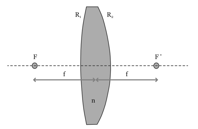 Where - \(n_2\) is the refractive index of the lens - \(n_1\) is the refractive index of the surrounding medium - \(R_1\), \(R_2\) are the radii of curvature of the two surfaces