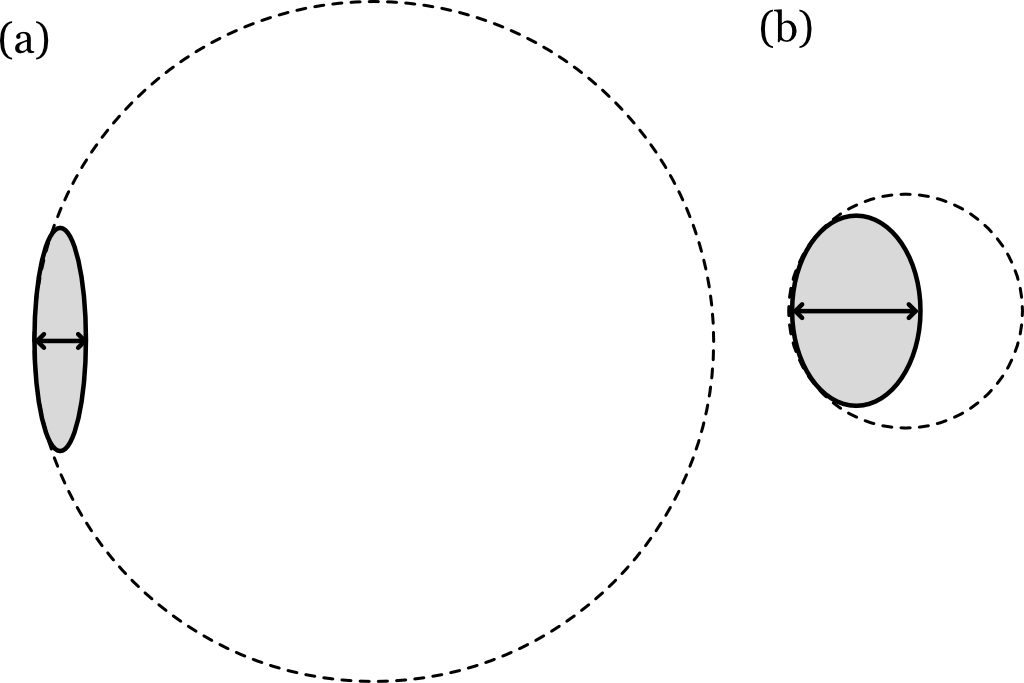 Suppose we wish to magnify the image, but we want to maintain the image irradiance level. In that case, we must capture \(4\) times as much light. We do this by increasing the lens diameter, \(D\). The formula for the area of the aperture is \(\pi (D/2)^2\); thus, doubling the diameter, \(D\), increases the area by a factor of \(4\).