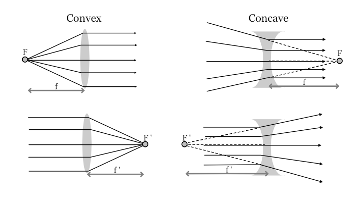 Figure 9.3 shows the important concept of the primary and secondary focal points of a convex and concave thin lens. The primary focal point (F) is the location on the optical axis such that any ray coming from it towards the lens travels parallel to the axis after refraction. The distance from that point to the middle of the lens is called the focal length. The secondary focal point (F’) is the axial point such that any incident ray traveling parallel to the axis will, after refraction, proceed toward, or appear to come from it. The secondary focal point has its own focal length.